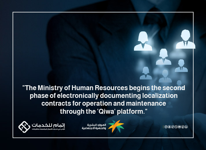 On Saturday, June 1, 2024, the Ministry of Human Resources and Social Development will begin implementing the second phase of the decision to adopt the electronic contract documentation service for the Localization Initiative in public sector operations and maintenance contracts. This service is part of the electronic services provided by the ministry through the "Qiwa" platform, and this phase will apply the decision to large enterprises.