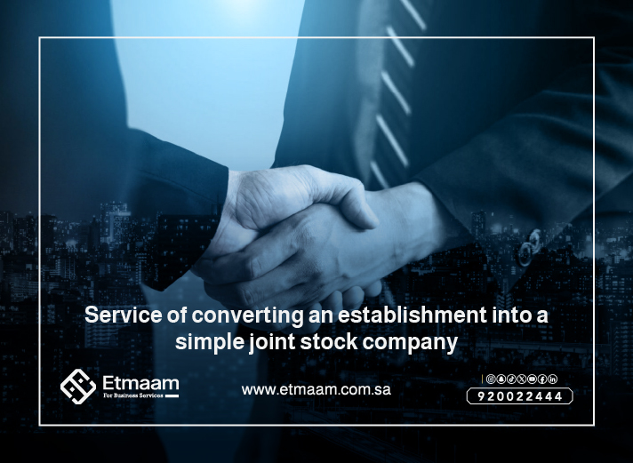Converting an establishment into a simplified joint-stock company is one of the strategic steps that support growth and expansion, but it requires a careful plan to ensure compliance with the laws and benefit from the available advantages. Therefore, it is recommended to rely on a specialized company with legal expertise to ensure that the conversion process is completed smoothly and successfully. We at Etmaam are happy to provide all services to help you. Contact us.